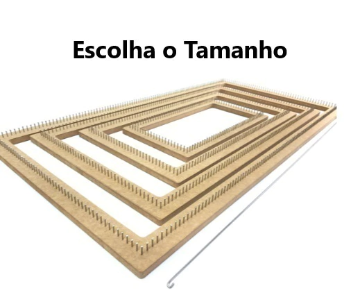 TEAR DE PREGOS RETANGULARES, são os modelos mais tradicionais para fazer tapetes, jogo americano e centro de mesas. A peça fica no formato e tamanho do tear.